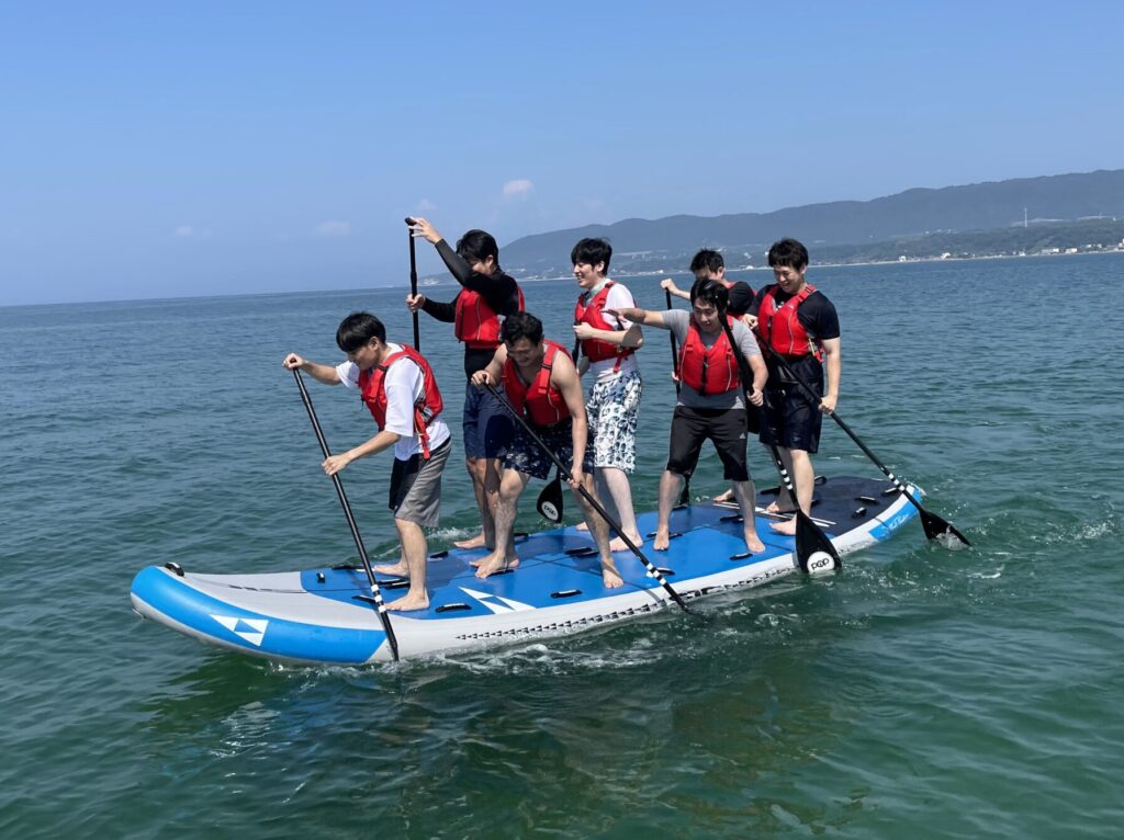 通常のSUPボードは1人乗りですが、MEGA SUPは複数人(場合によっては最大8〜10人)で一緒に乗ることができる巨大なボードです。長さは5メートル、幅も広く、安定性が高いのが特徴です。 - チームワークが必要